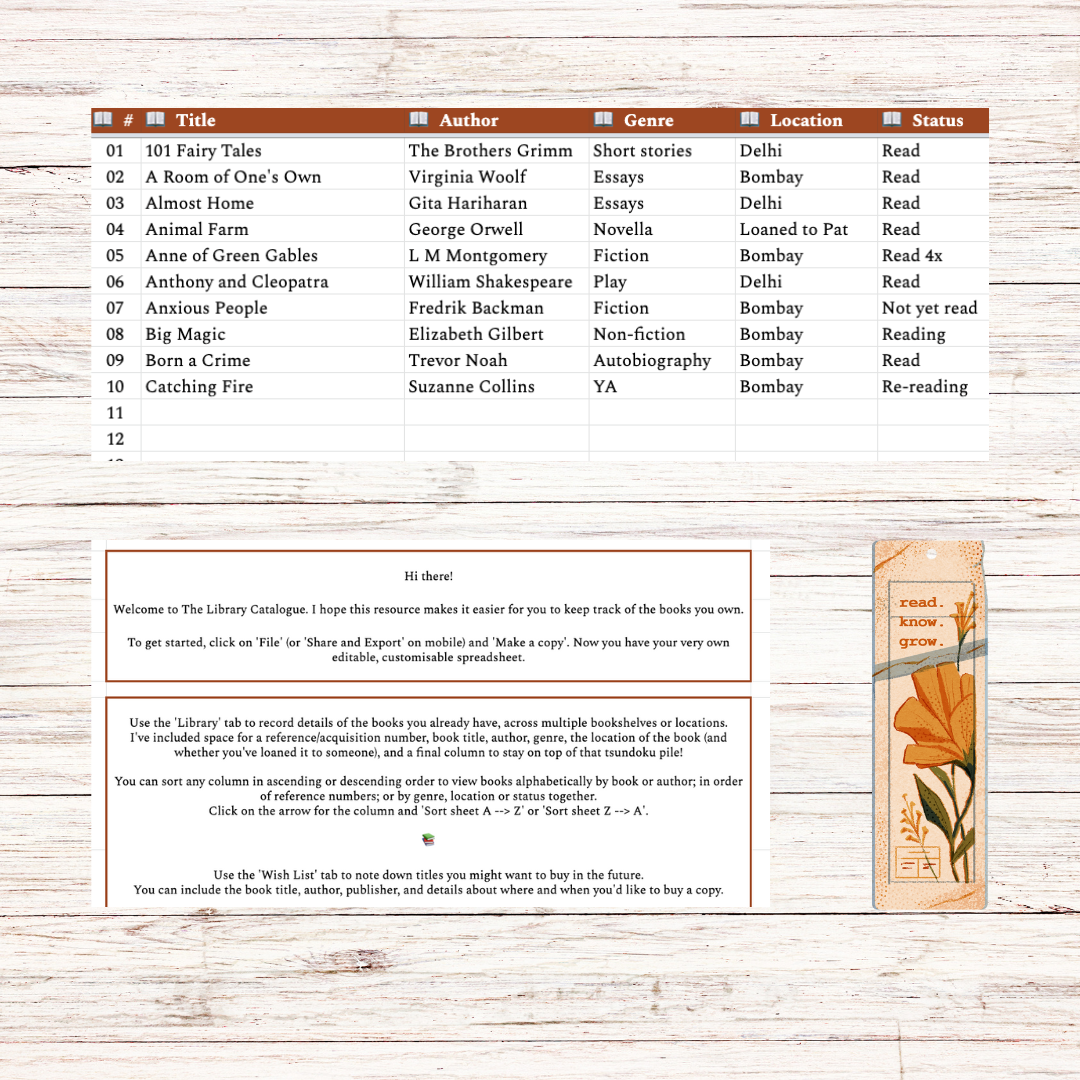 A spreadsheet to help you catalogue your personal library, and keep track of the books you own across locations. You can record details including title, author, genre, location and reading status. Click to expand the features below for more information.