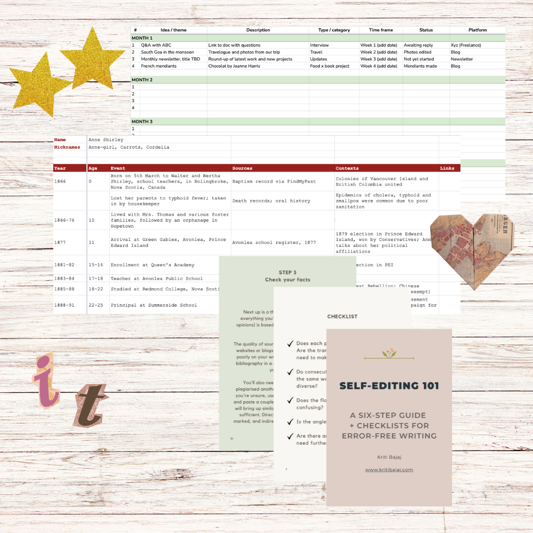 A collection of three useful digital resources if you’re writing a biography or life story. Organise and plan your writing schedule, create a life timeline to reference during the writing process, and self-edit your final draft. This bundle includes (click to expand each item for more information):