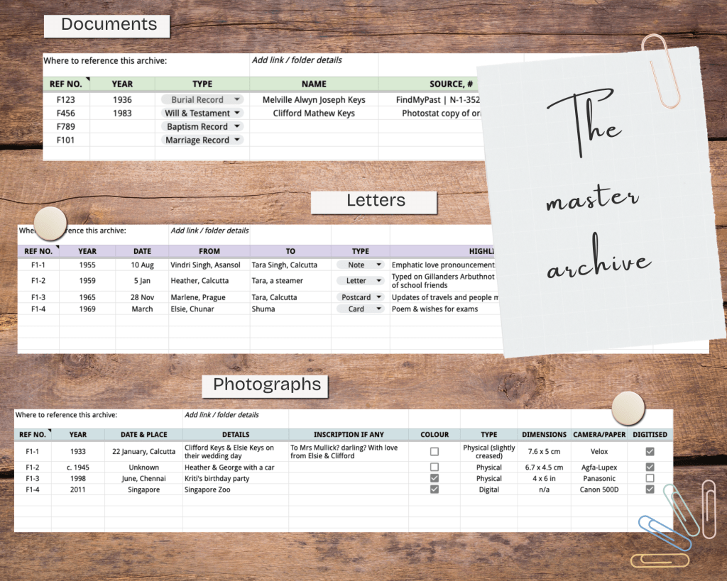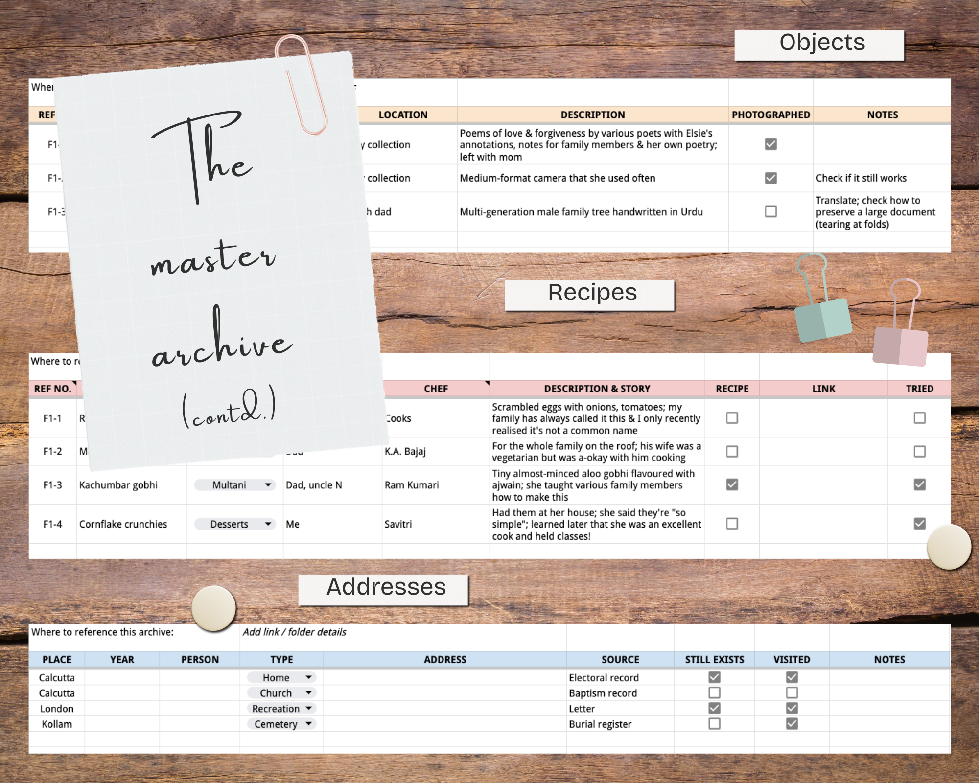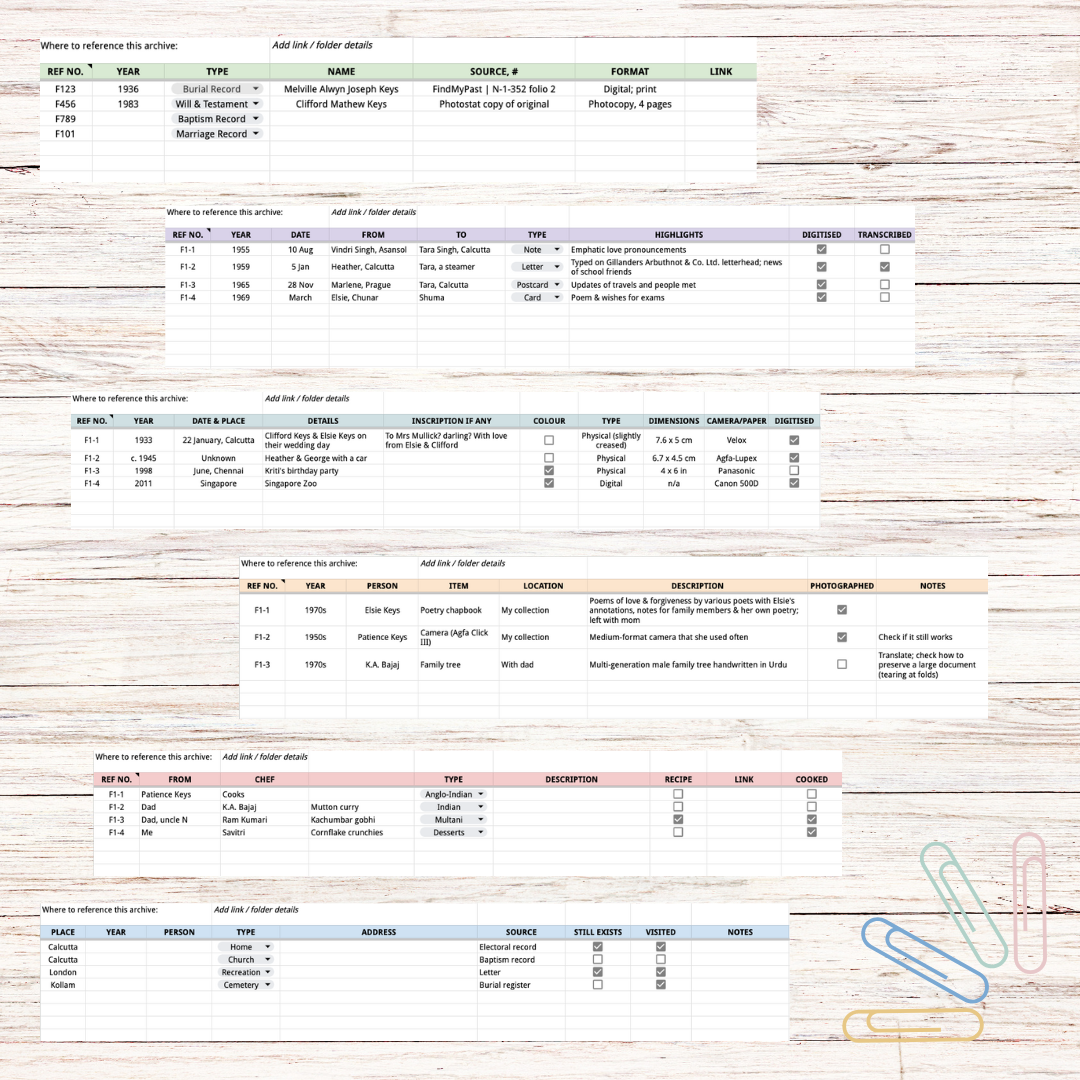 Welcome to your ultimate multi-category filing system! Record information about the documents, letters, photographs and objects in your archive, as well as places and recipes, in six dedicated tabs with detailed, well-thought out categories that I use for my own collections. Click to expand the features below for more information.